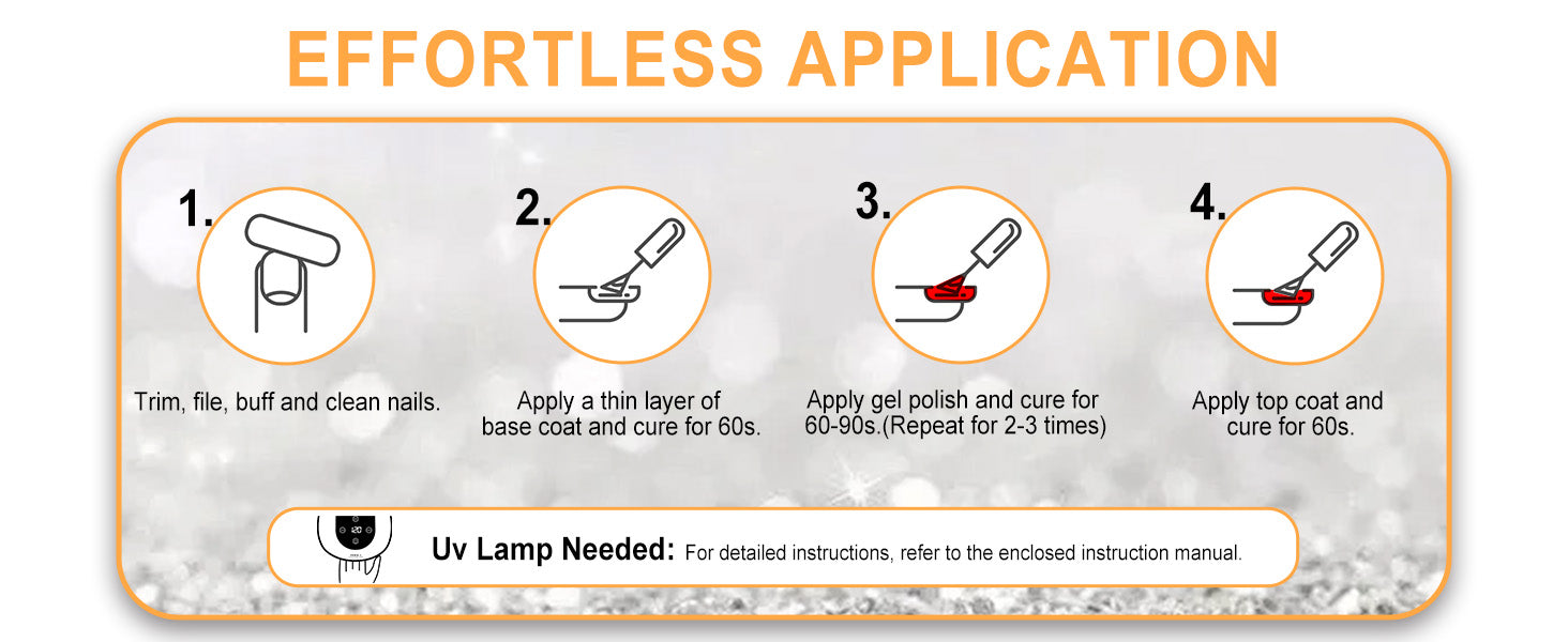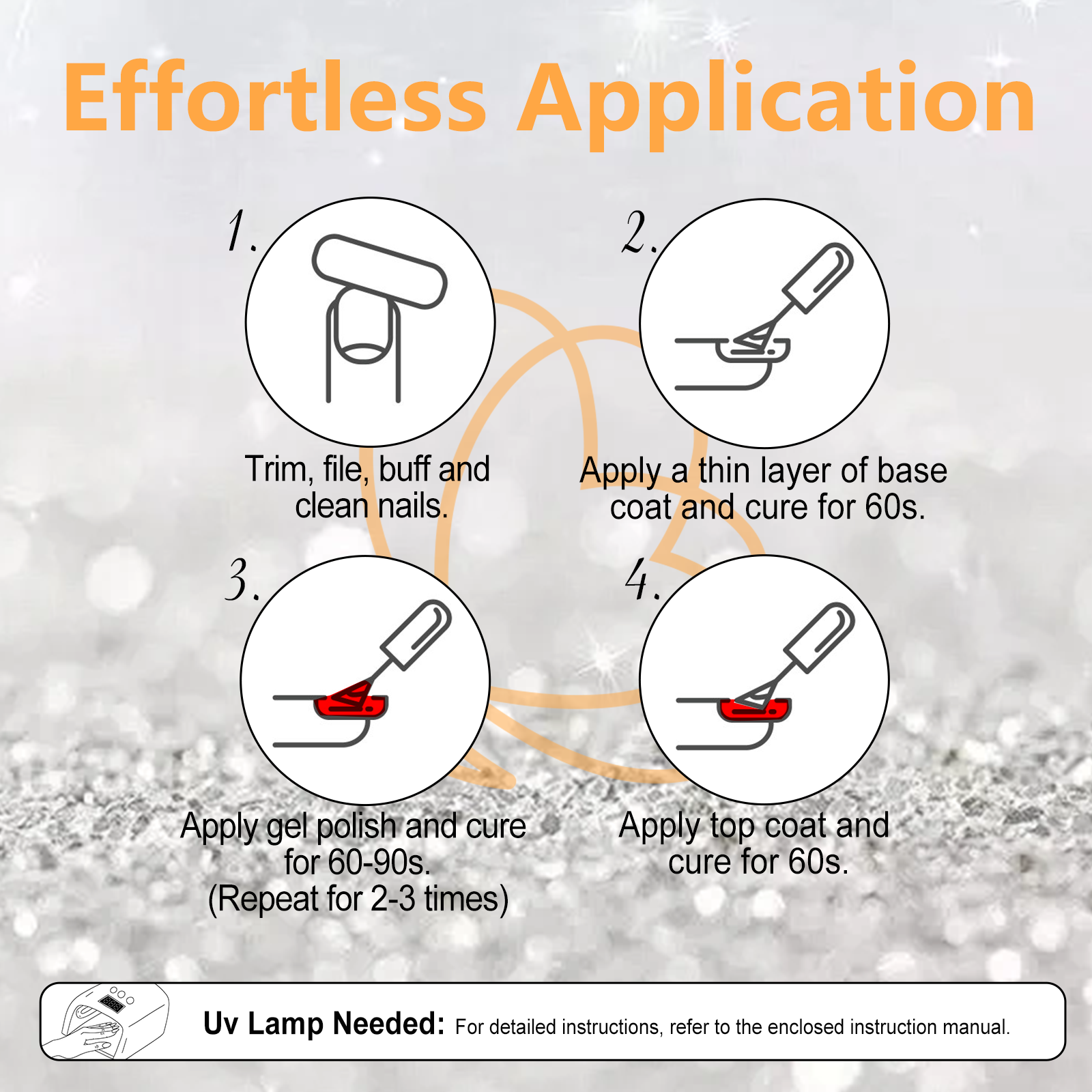 Compatible with LED & UV lamps; requires Base Coat & Top Coat Gel.