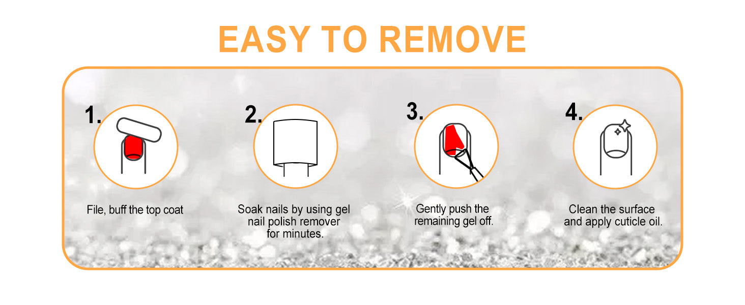To remove, soak in remover for 5-10 minutes and apply cuticle oil for nail care.