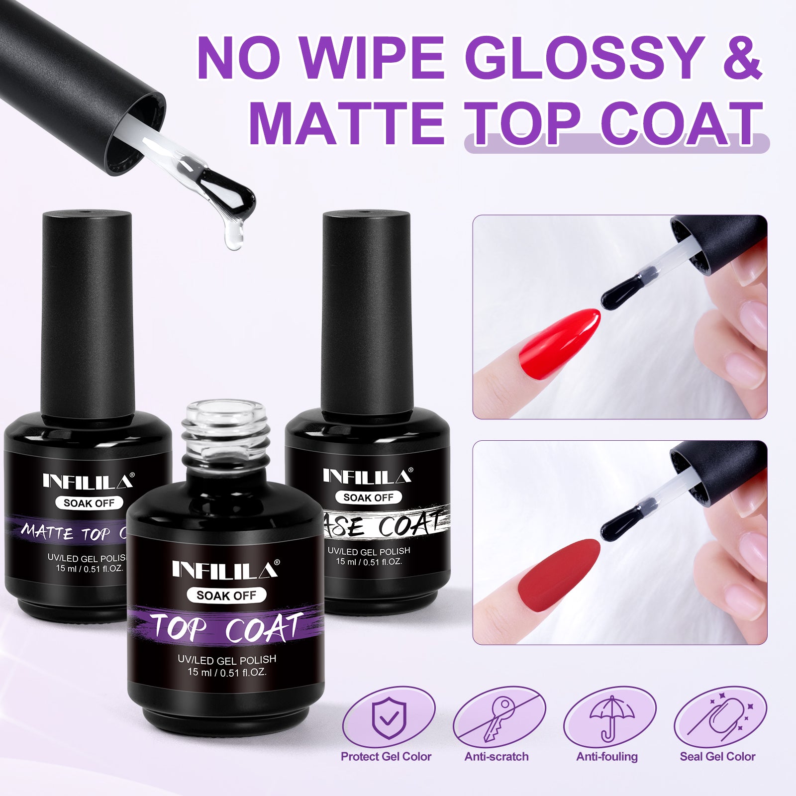 - NXJ INFILILA Gel Top Coat and Base Coat Kit: You will get 1*15ml Base Coat+ 1*15ml No Wipe Shine Top Coat+ 1*15ml Matte Top Coat. No harsh ingredients or adhesives lead to damaged nails. Compatible with All Brands Gel Nail Polish. Suitable for natural nails, gel nails, artificial nails, acrylic nails, nail tips, etc.