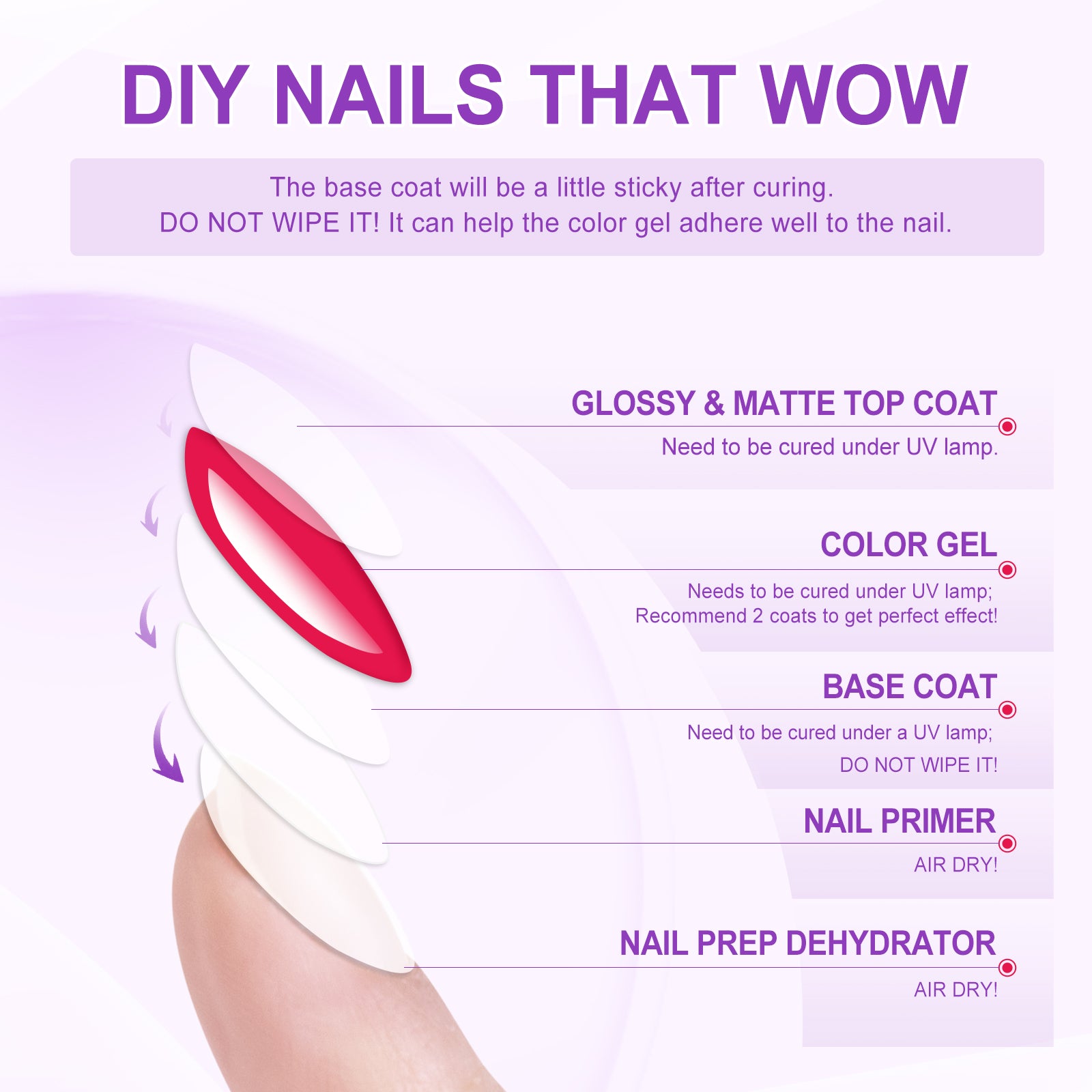 - Effective Functions of Base Coat: Apply a thin and average base coat and make your nail art stay longer. The base gel will look wet and sticky, it can help the color gel adhere well to the nail. Base and top coat avoid nicks, chips, and smudges. Easy application and good tenacity. It can last for over 28 days with a proper application.