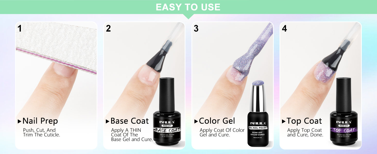 Compatible with LED & UV lamps; requires Base Coat & Top Coat Gel.
