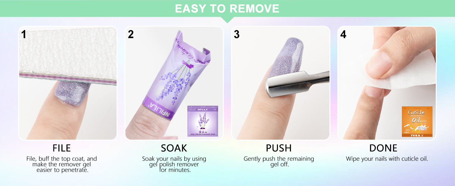 To remove, soak in remover for 5-10 minutes and apply cuticle oil for nail care.