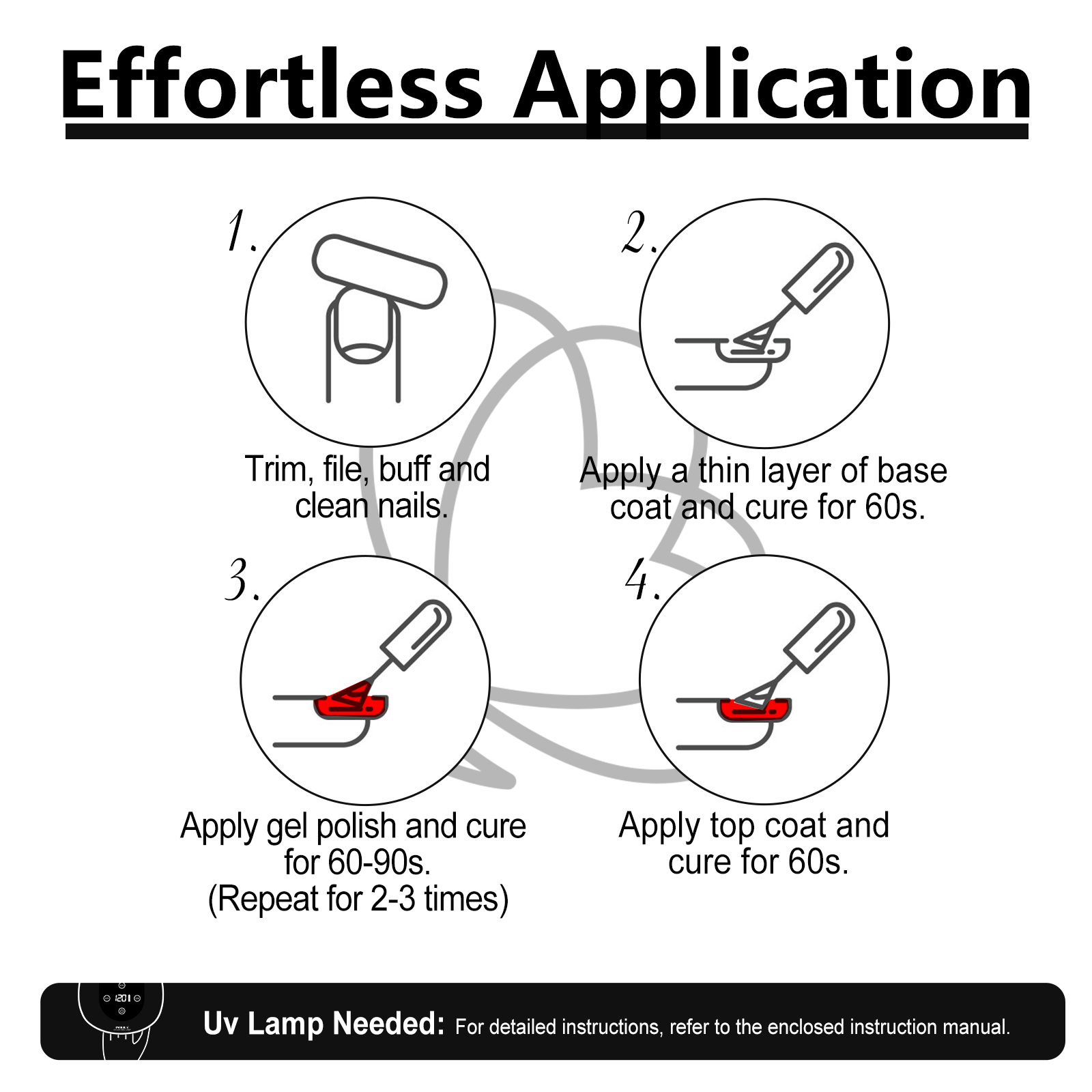 Compatible with LED & UV lamps; requires Base Coat & Top Coat Gel.